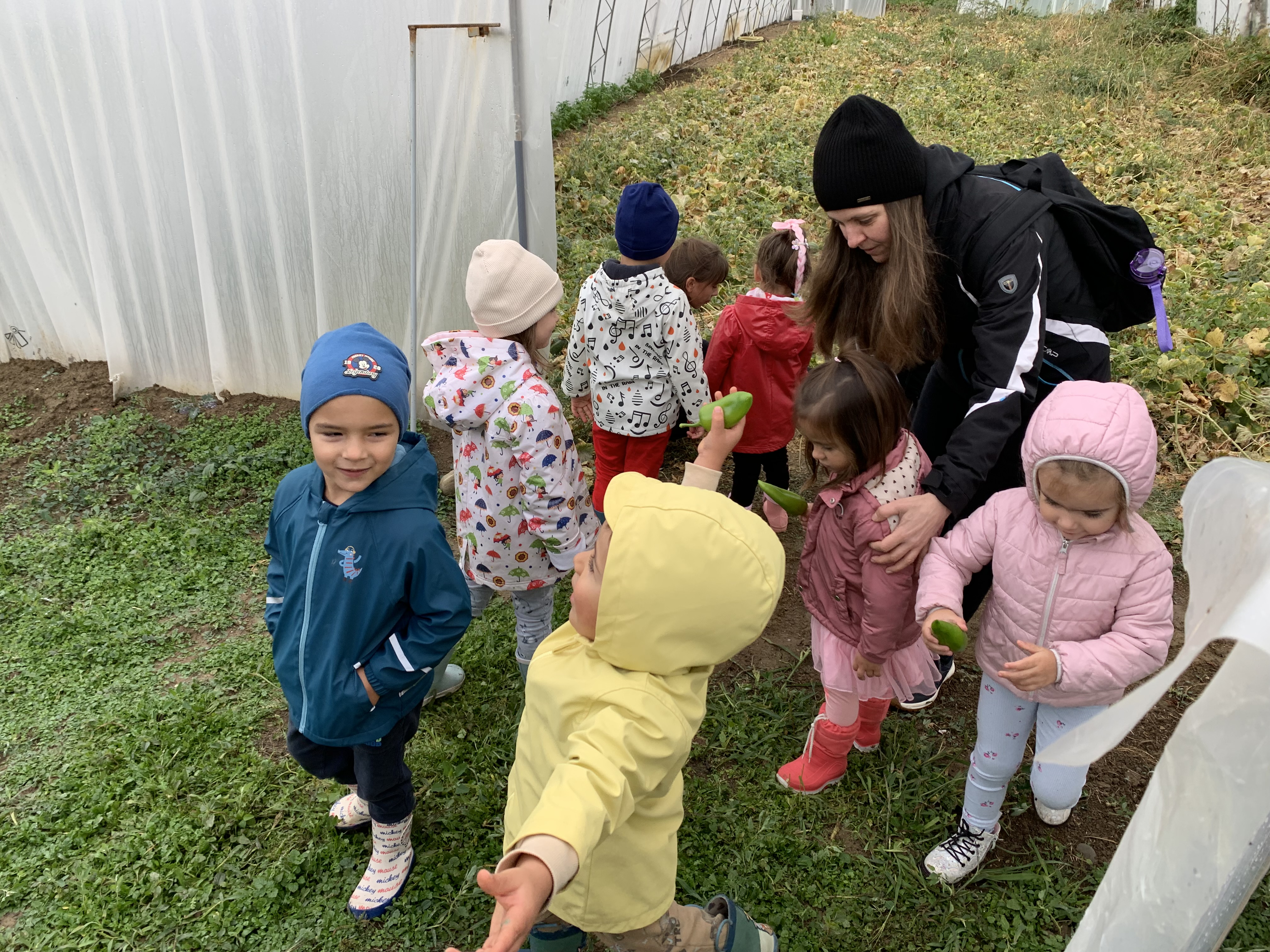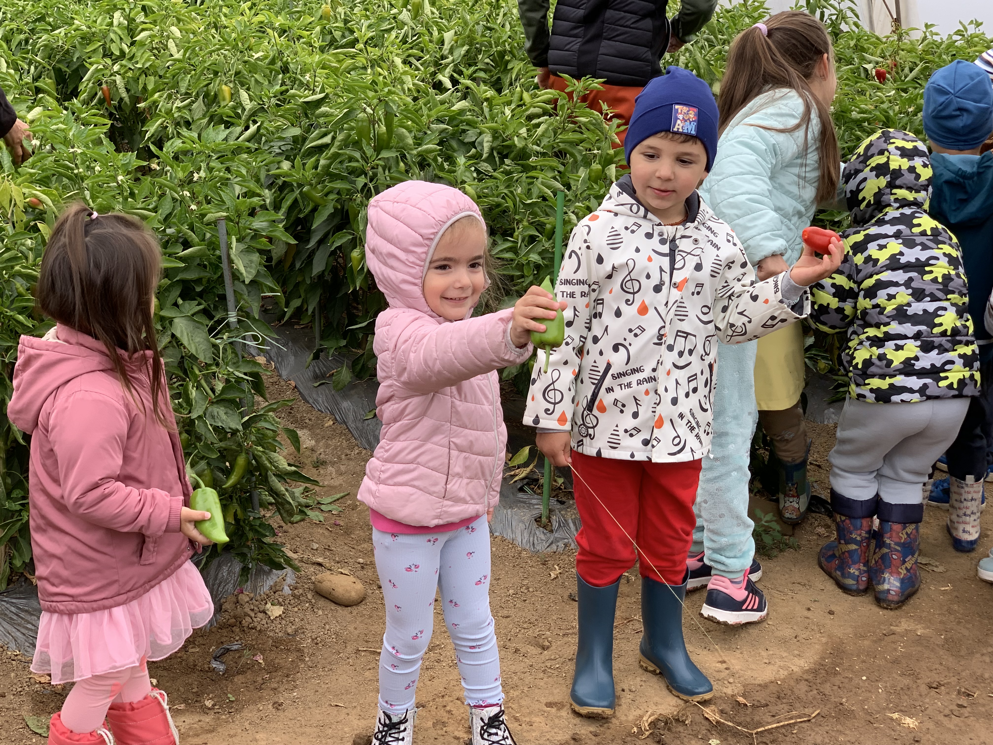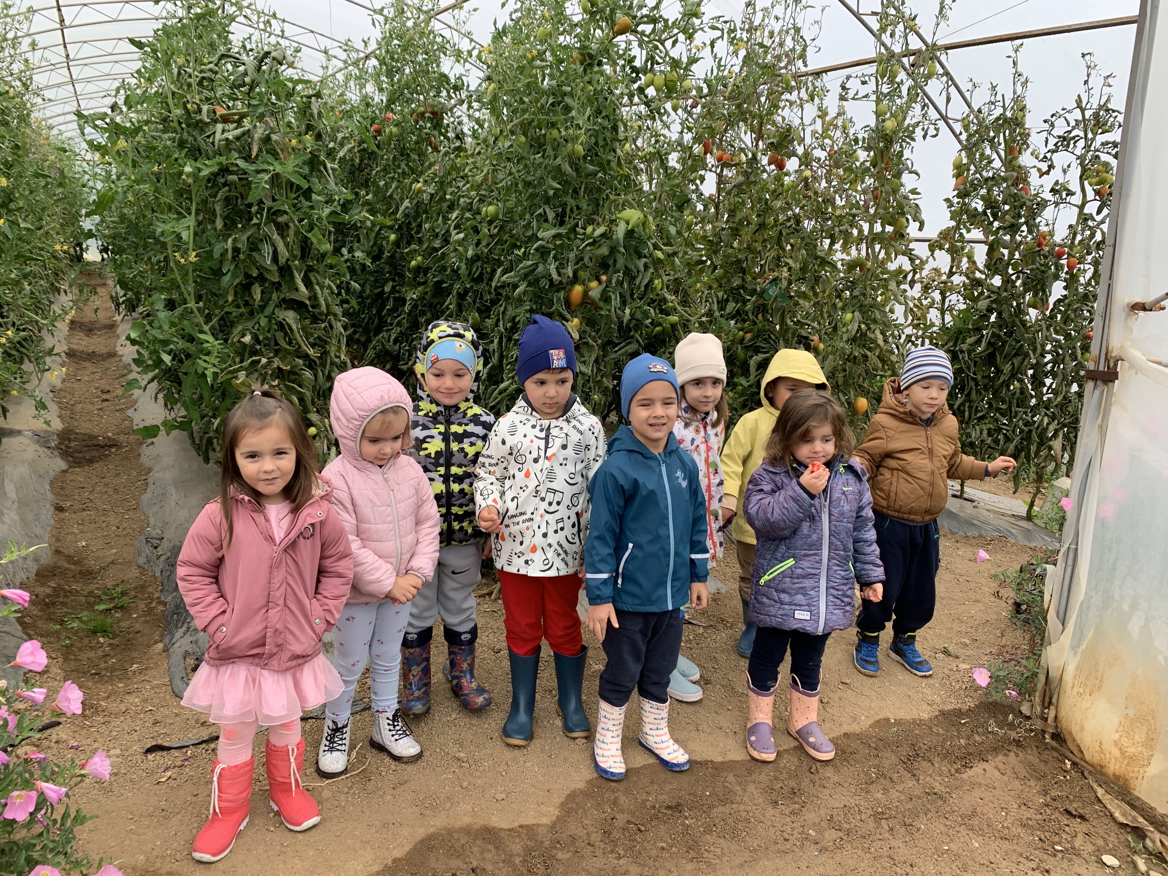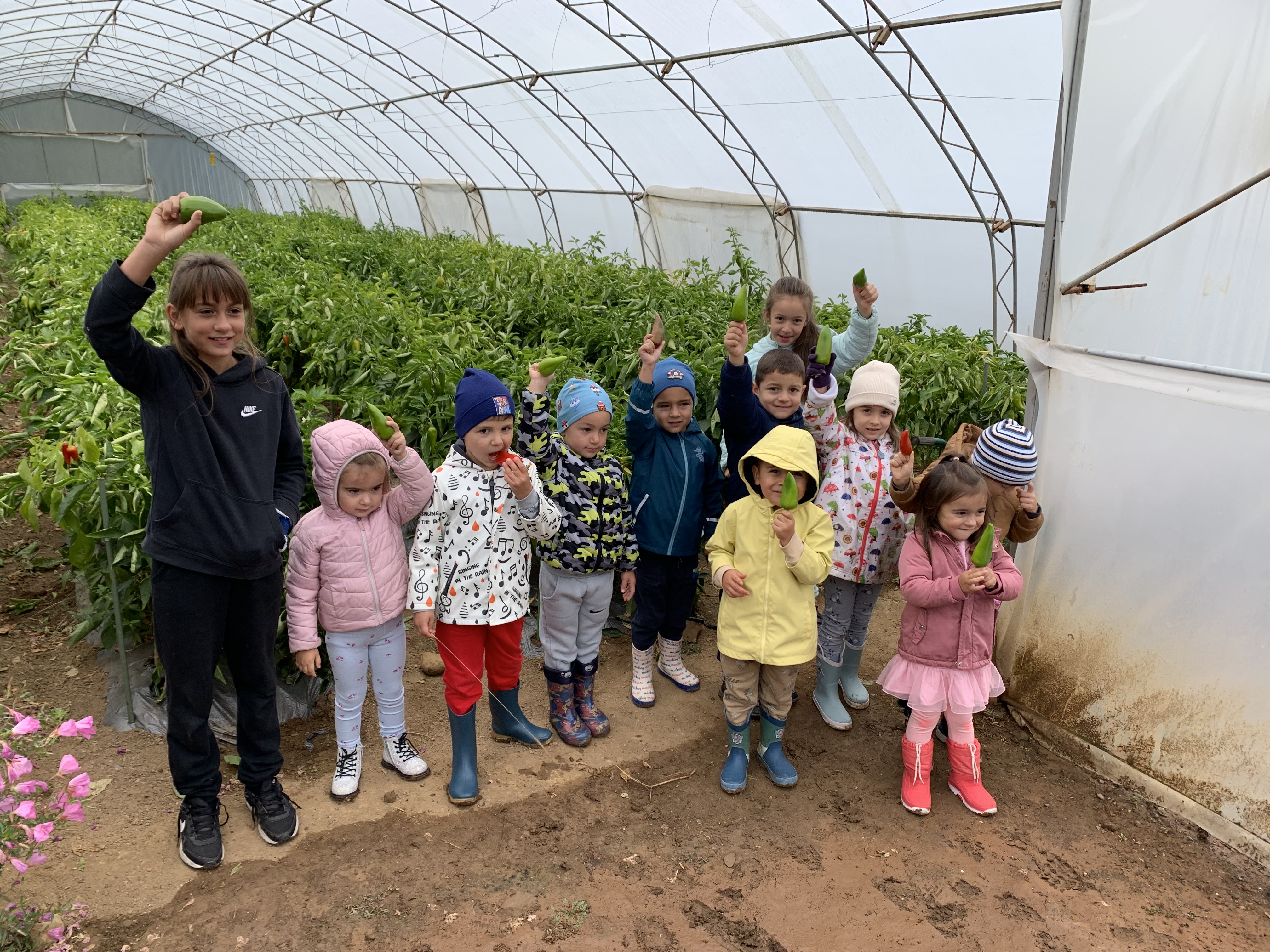 На 4 октомври малките Слънчовци и техните родители посетиха общинските екооранжерии. Децата научиха повече за професията „градинар“, инструментите, с които си служат градинарите и какви грижи полагат при отглеждане на растенията. Малчуганите с любопитство разгледаха четирите оранжерии и полето със зреещи тикви. Заедно с госпожа Мавродиева и госпожа Хасъмска изиграха играта „Зеленчукова щафета“ и благодариха на домакините с песен. Всяко дете опита от вкусните домати, чушки и краставици, които се отглеждат в оранжериите.