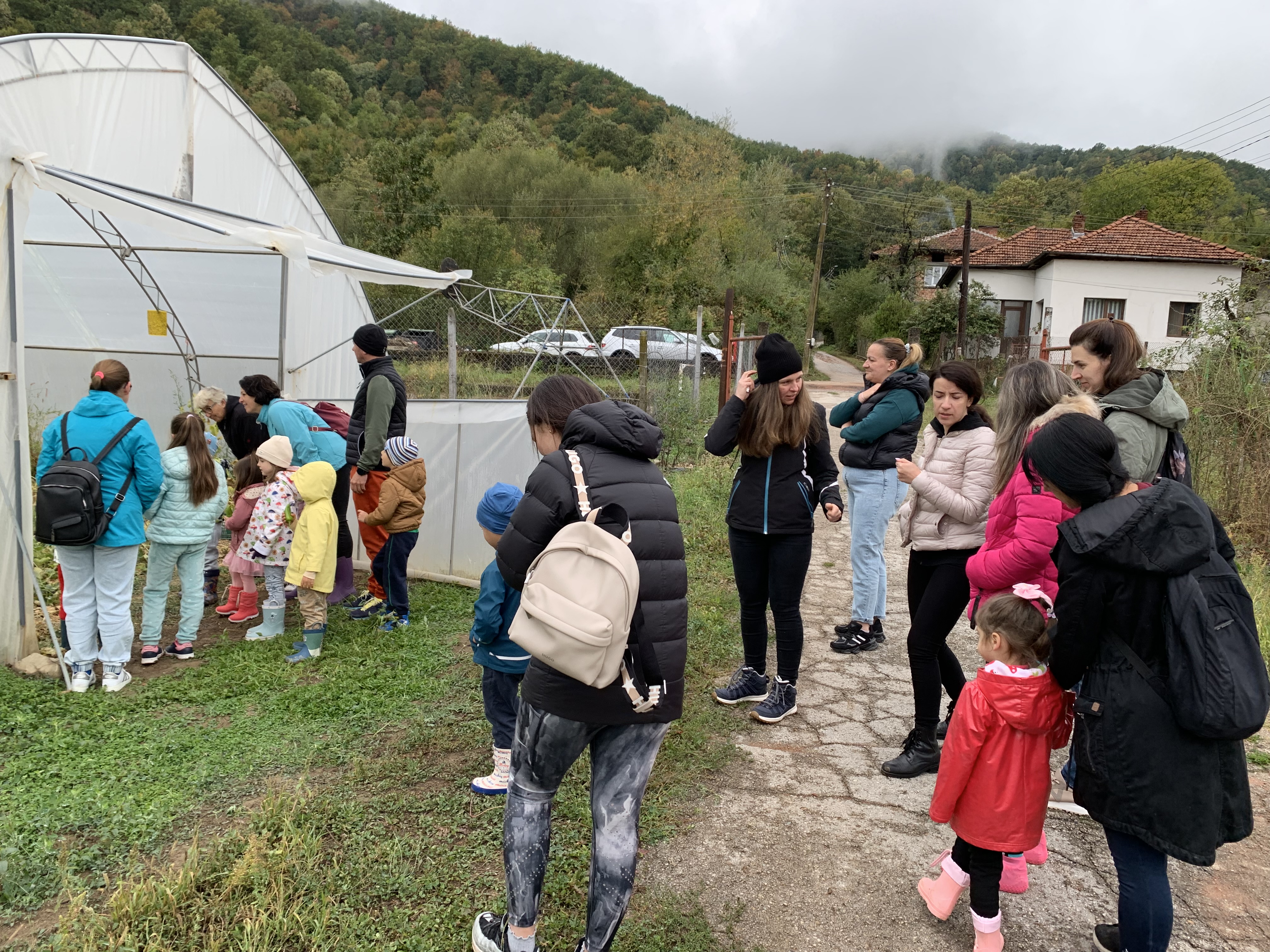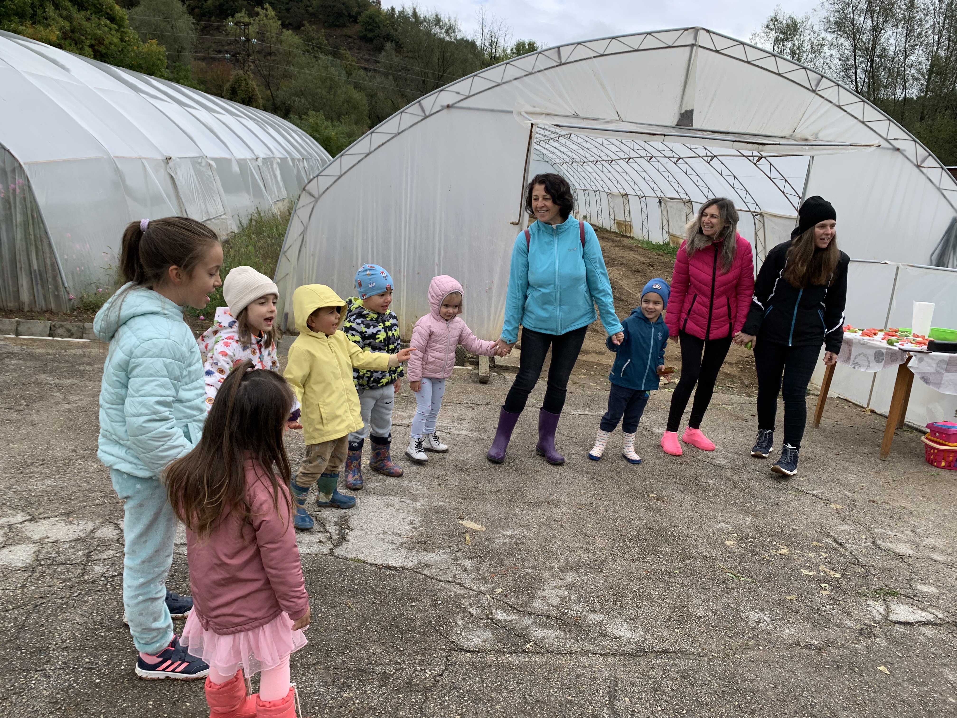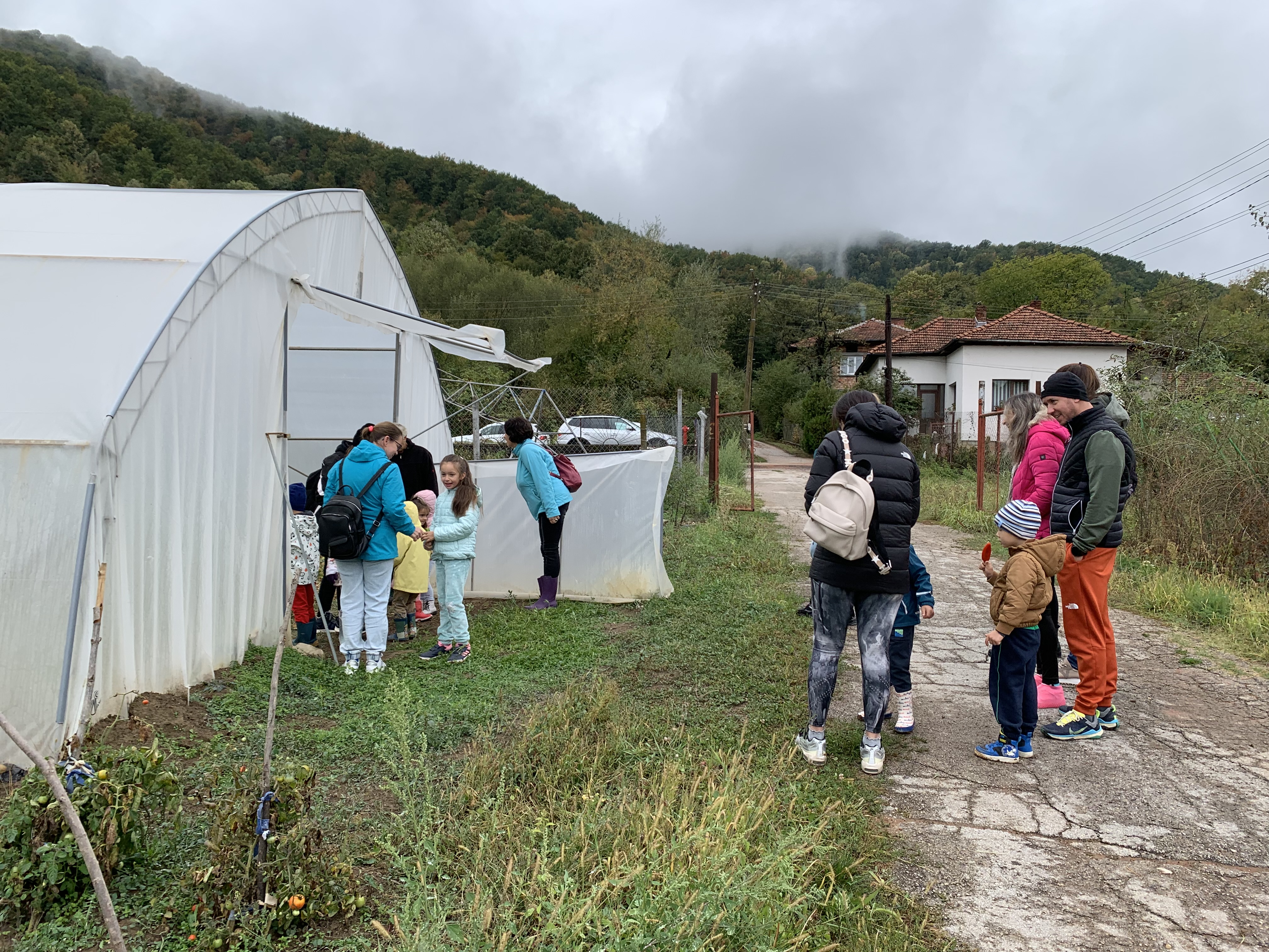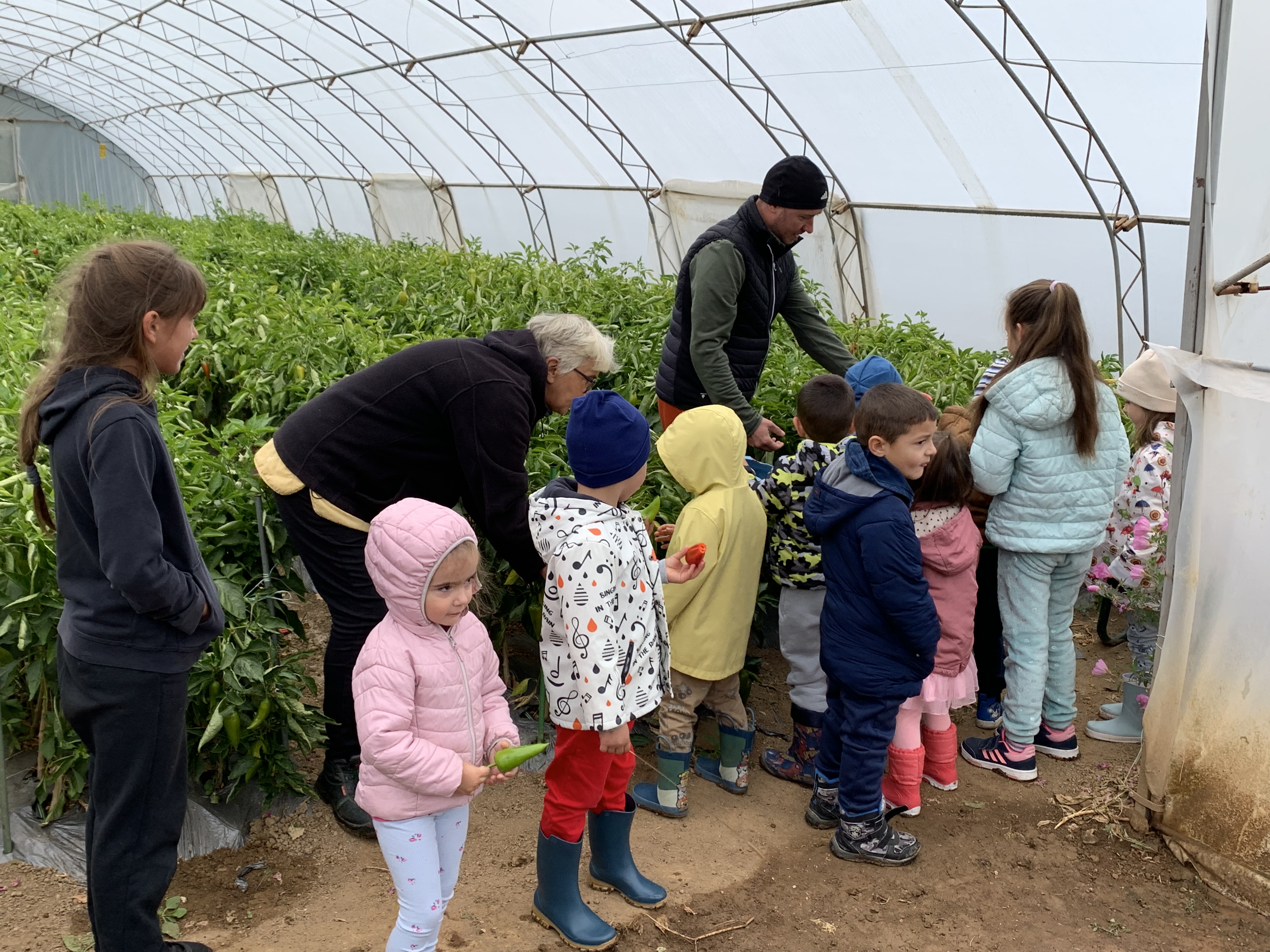 На 4 октомври малките Слънчовци и техните родители посетиха общинските екооранжерии. Децата научиха повече за професията „градинар“, инструментите, с които си служат градинарите и какви грижи полагат при отглеждане на растенията. Малчуганите с любопитство разгледаха четирите оранжерии и полето със зреещи тикви. Заедно с госпожа Мавродиева и госпожа Хасъмска изиграха играта „Зеленчукова щафета“ и благодариха на домакините с песен. Всяко дете опита от вкусните домати, чушки и краставици, които се отглеждат в оранжериите.