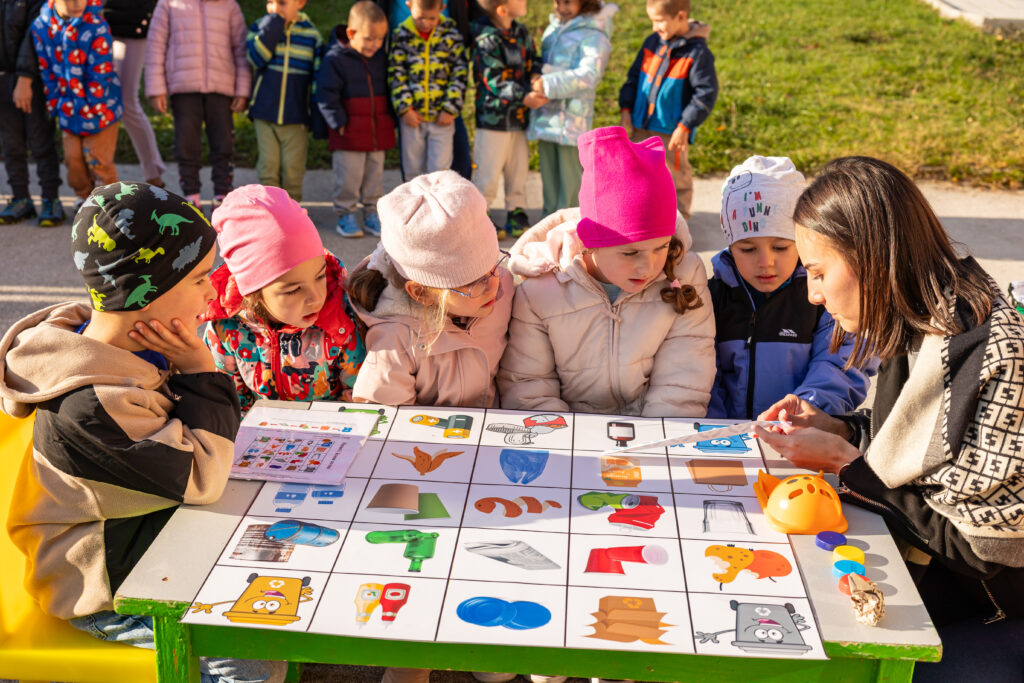 На полето са разположени цветни предмети, имитиращи отпадъци. Чрез задаване на поредица от команди роботизираните играчки „събраха“ „отпадъците“ и да ги сортират извън игралното поле.