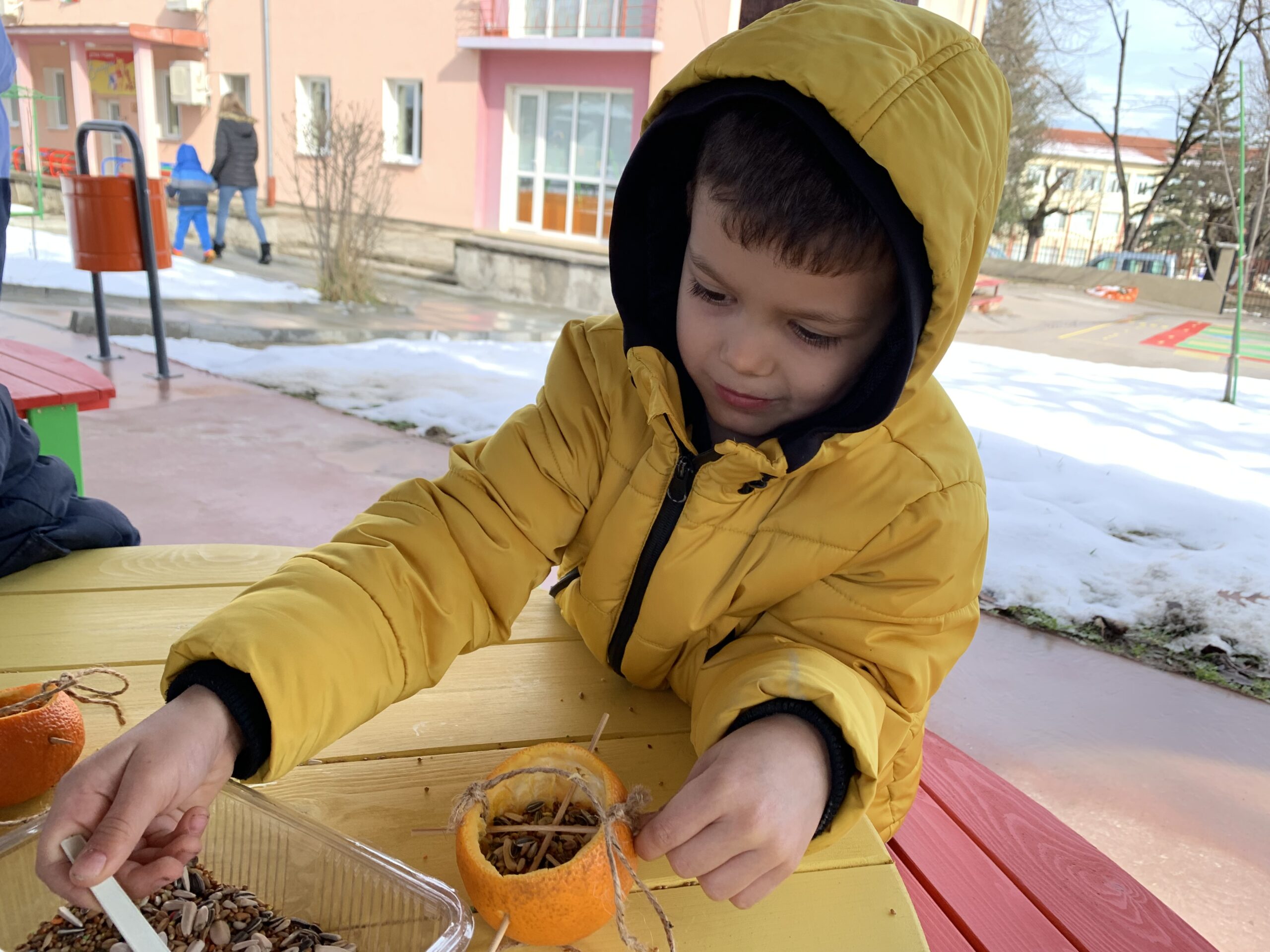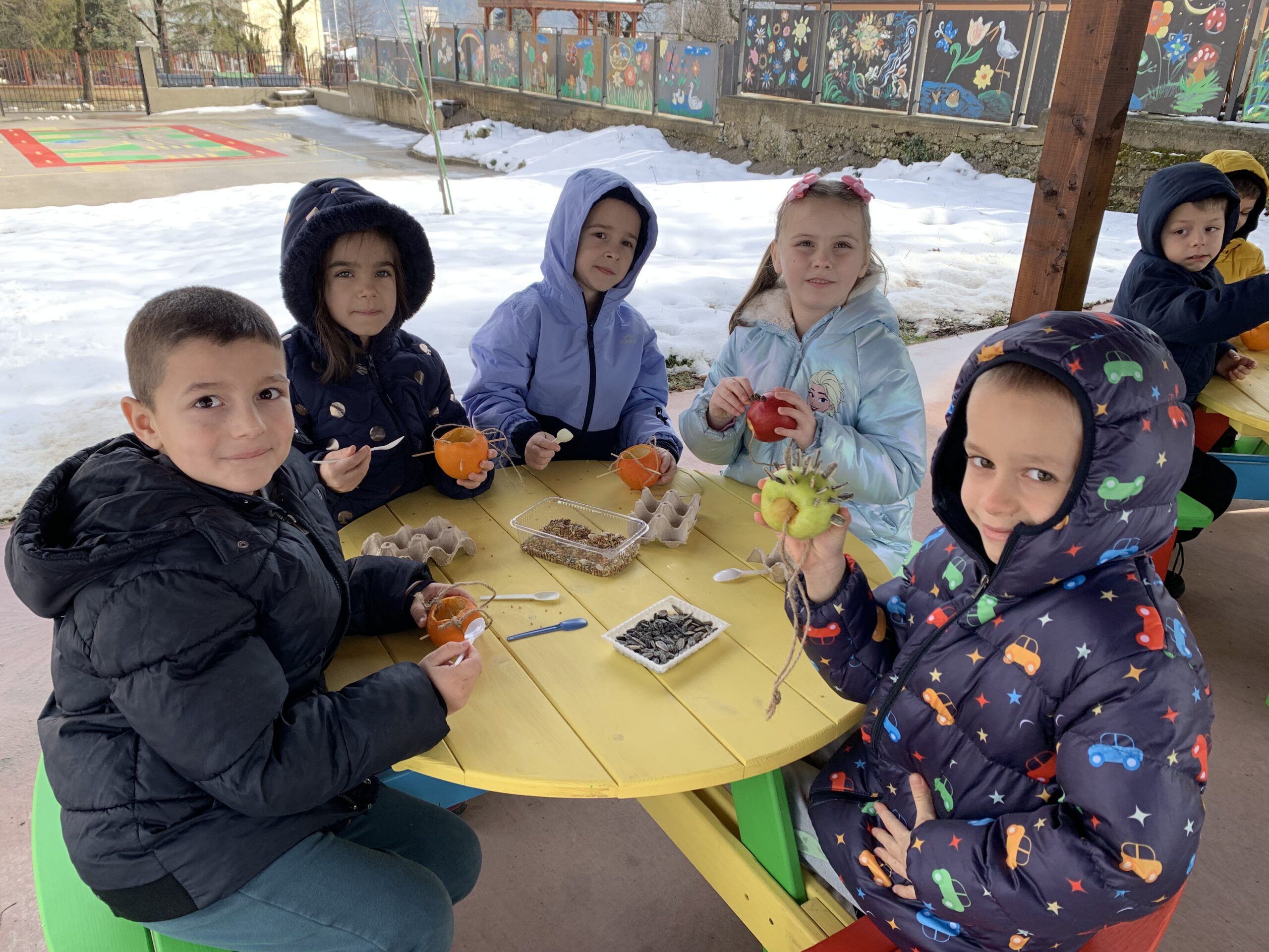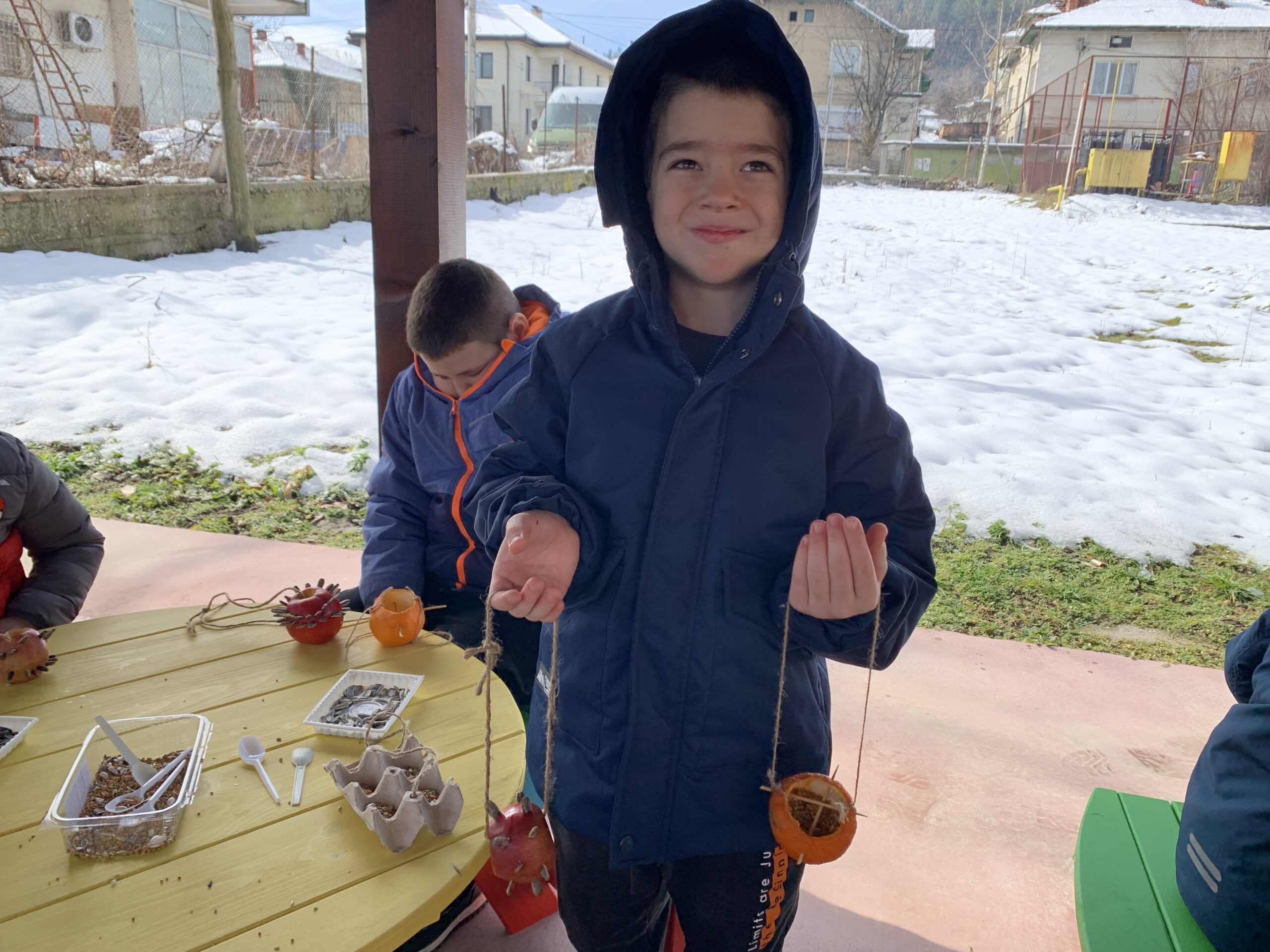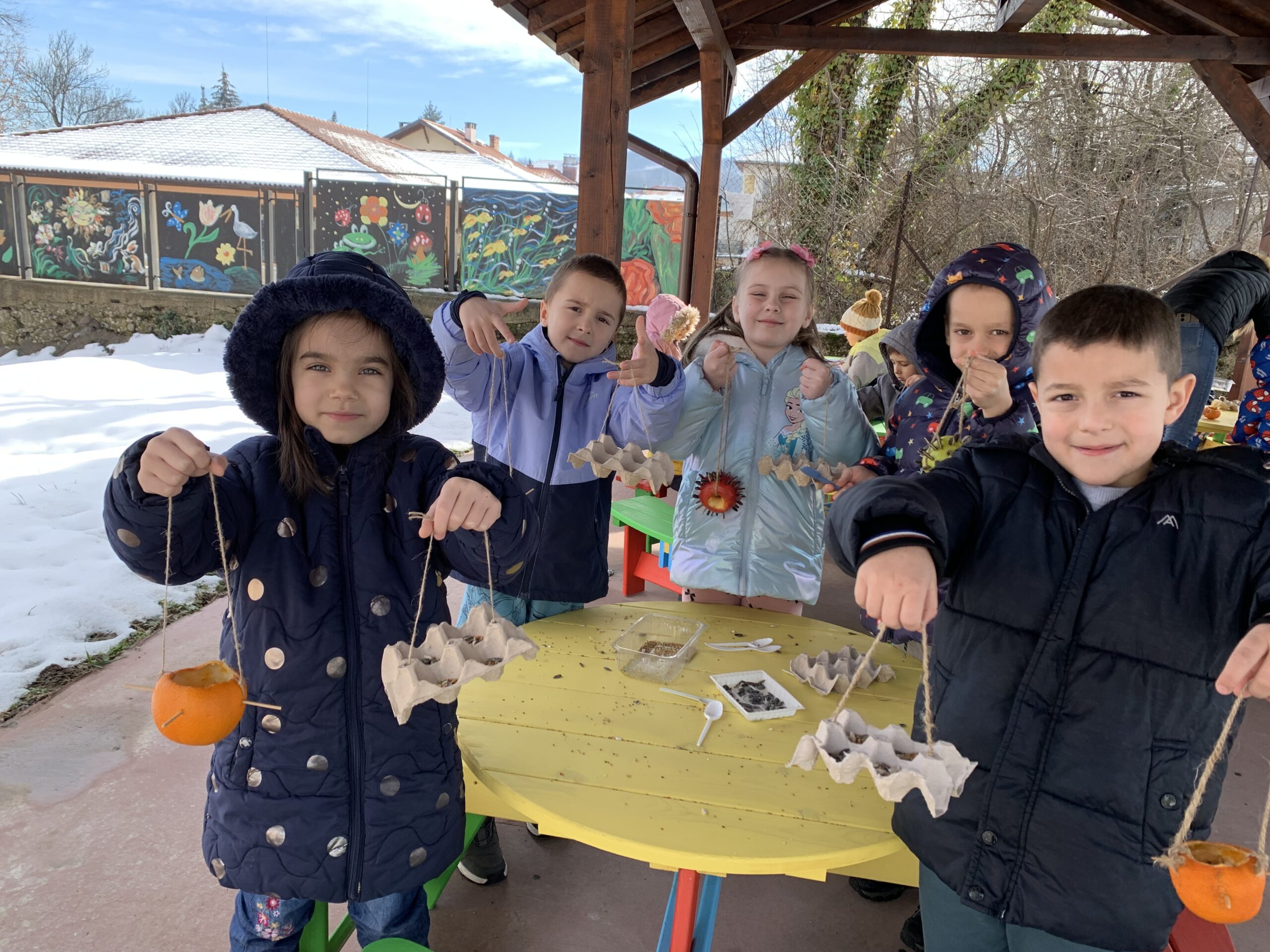 Зимата не е само студ и сняг. Тя дава чудесни възможности за активни игри и забавления на открито. Децата от група „Синигерчета“ и група „Пчеличка“ излязоха в двора на детската градина, за да се порадват на зимното слънце и да проучат какво се случва с техните приятели зимуващите птички. Снегът затруднява намирането на храна и част от видовете не успяват да оцелеят без човешка помощ. Затова малките палавници изработиха хранилки за зимуващите птици от екоматериали – картон, портокалови кори, ябълки, семена и др. Част от тях децата поставиха в двора на детската градина, а останалите – поставиха в близост до дома си.