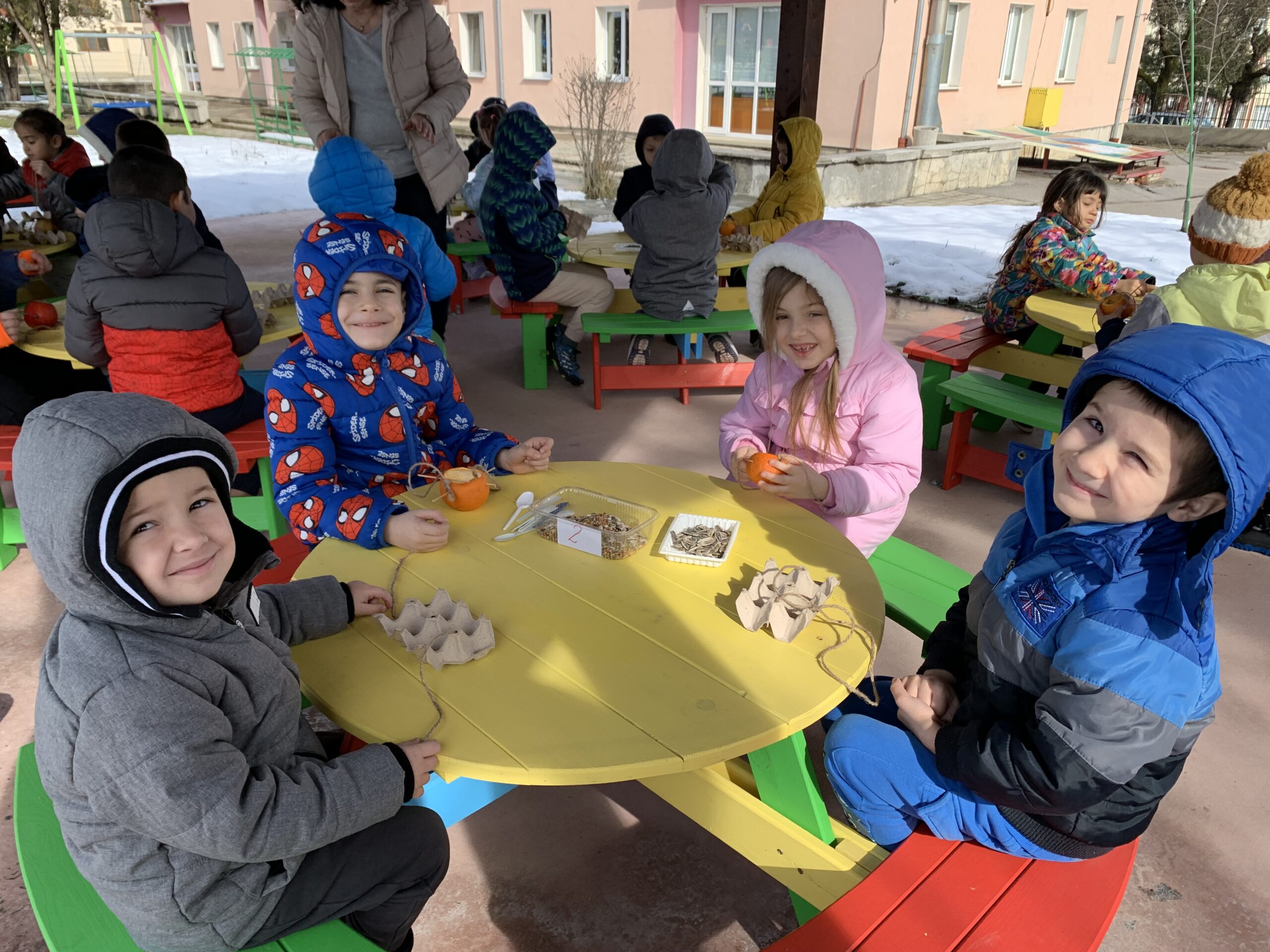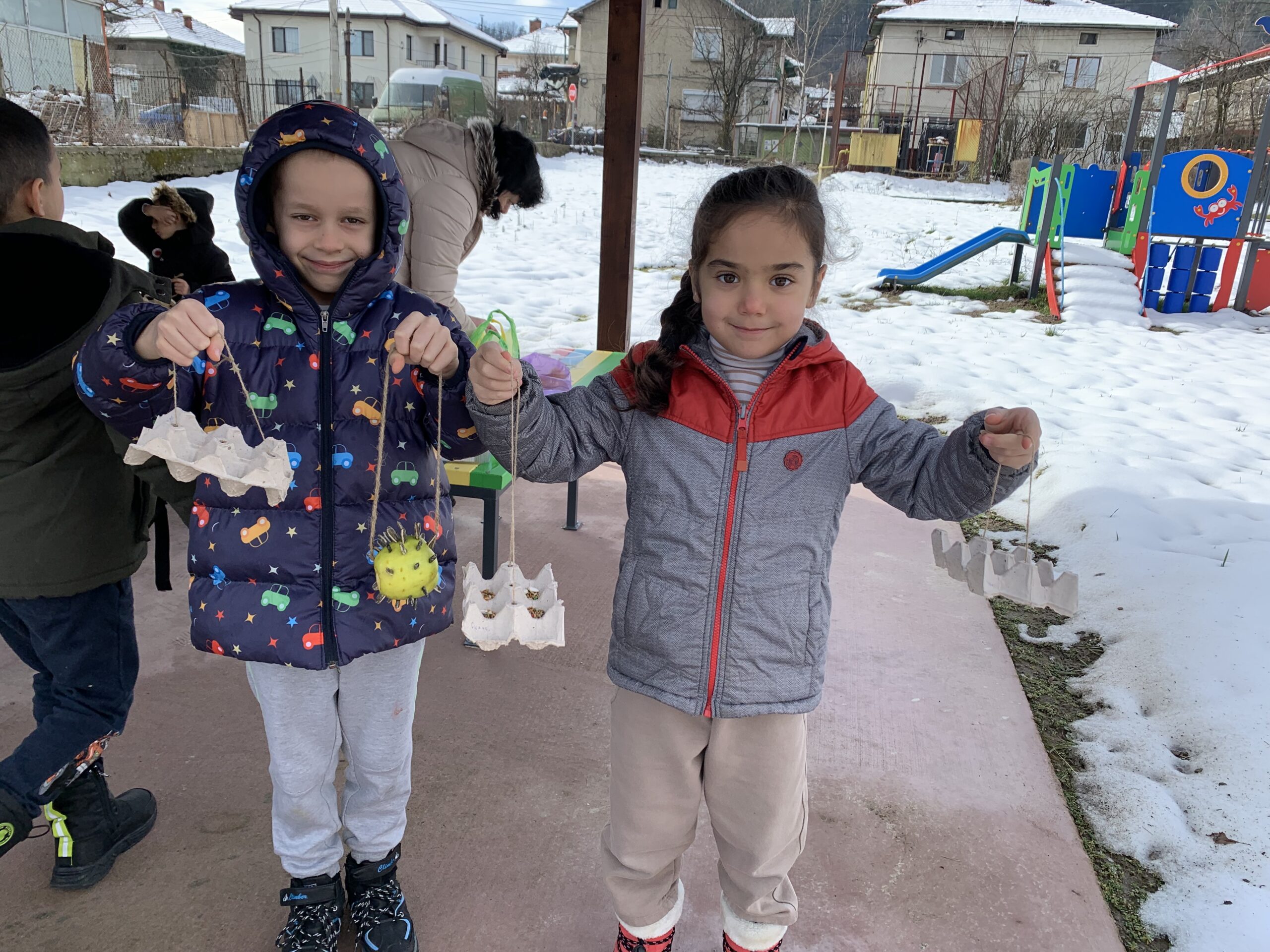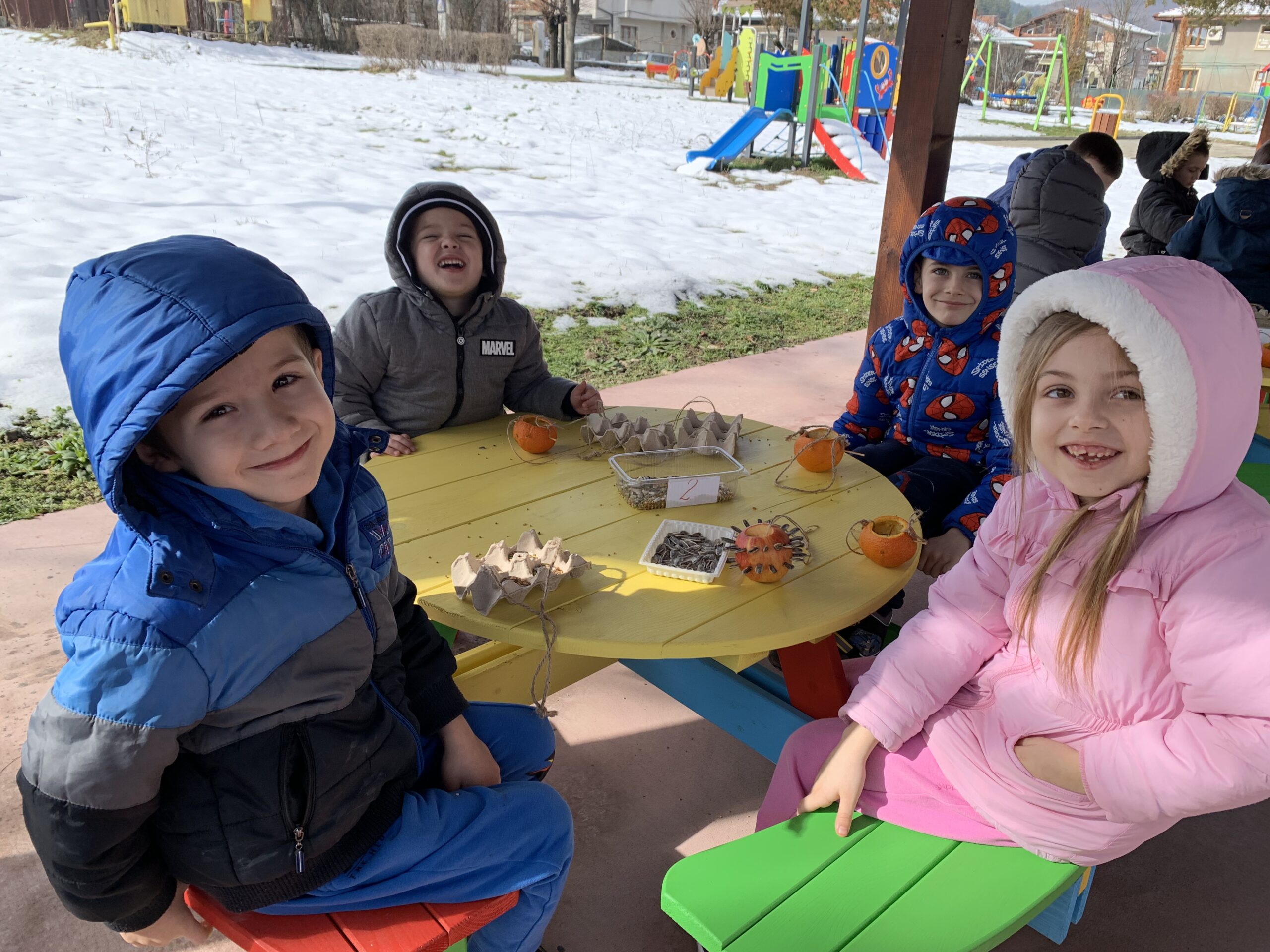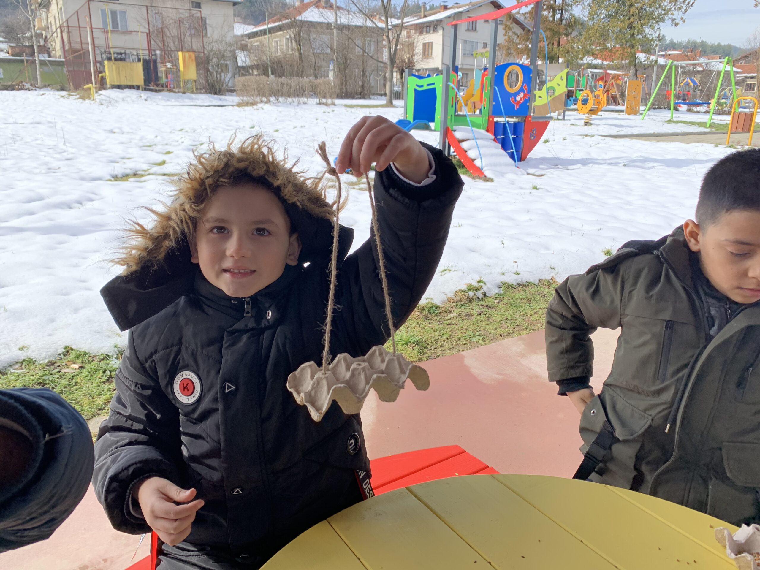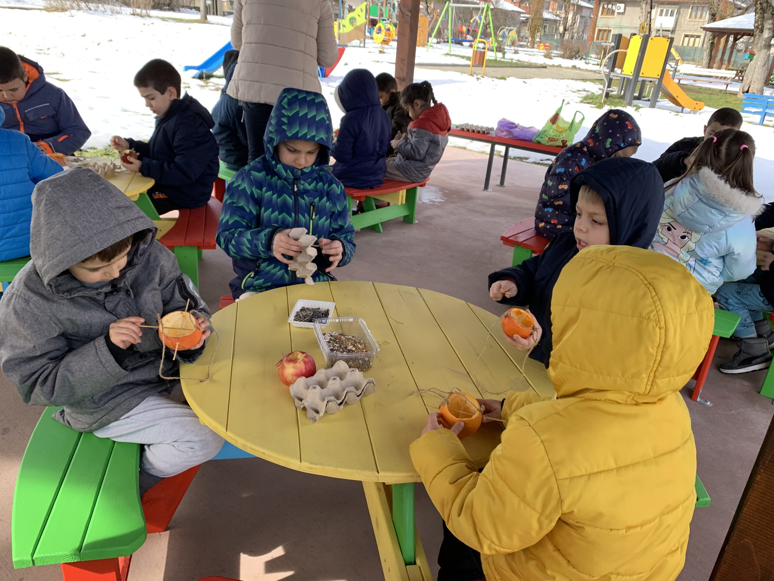 Зимата не е само студ и сняг. Тя дава чудесни възможности за активни игри и забавления на открито. Децата от група „Синигерчета“ и група „Пчеличка“ излязоха в двора на детската градина, за да се порадват на зимното слънце и да проучат какво се случва с техните приятели зимуващите птички. Снегът затруднява намирането на храна и част от видовете не успяват да оцелеят без човешка помощ. Затова малките палавници изработиха хранилки за зимуващите птици от екоматериали – картон, портокалови кори, ябълки, семена и др. Част от тях децата поставиха в двора на детската градина, а останалите – поставиха в близост до дома си.