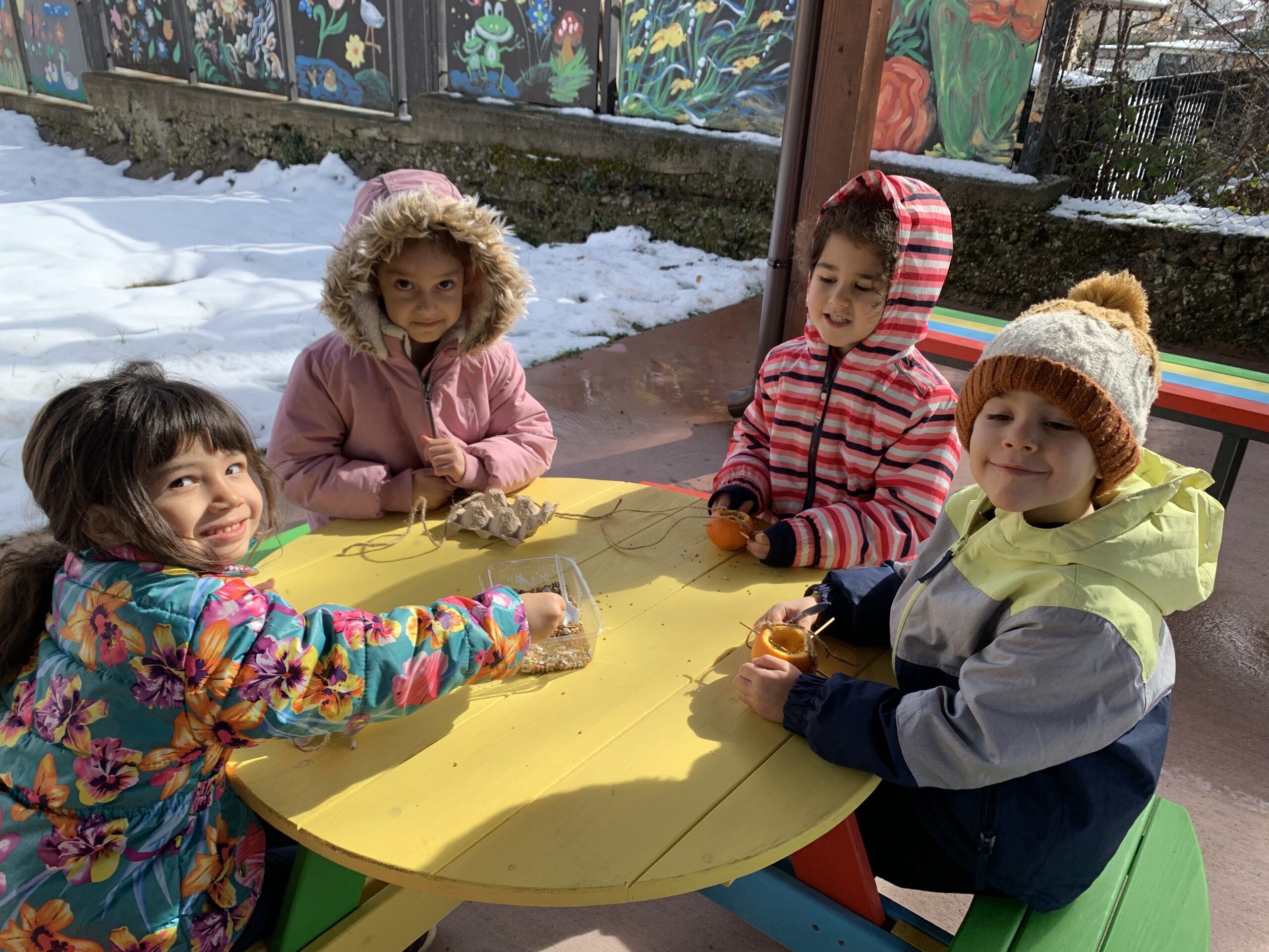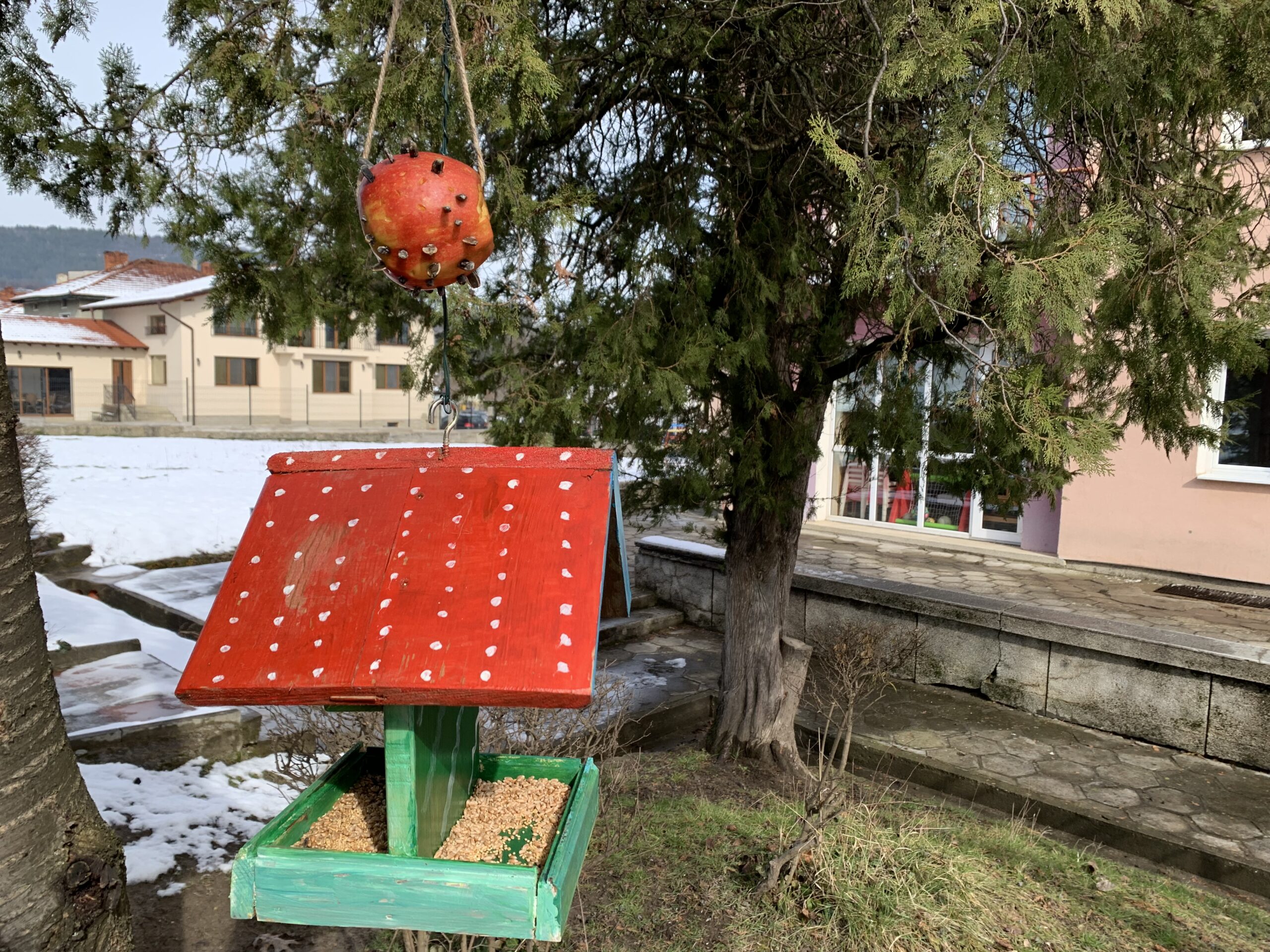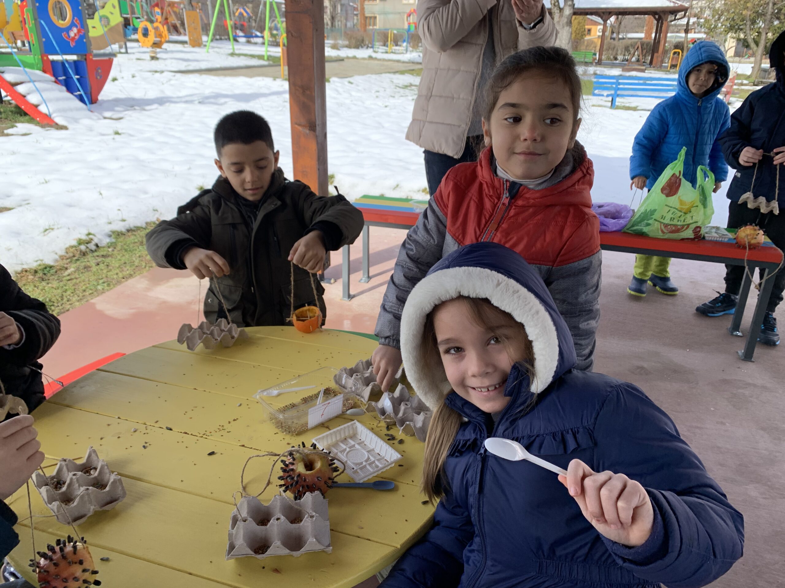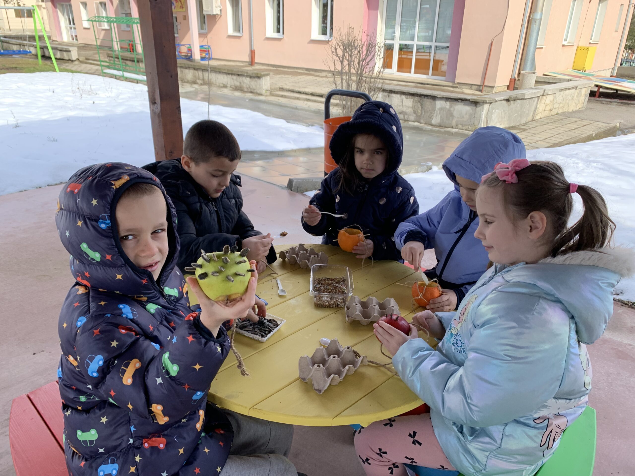 Зимата не е само студ и сняг. Тя дава чудесни възможности за активни игри и забавления на открито. Децата от група „Синигерчета“ и група „Пчеличка“ излязоха в двора на детската градина, за да се порадват на зимното слънце и да проучат какво се случва с техните приятели зимуващите птички. Снегът затруднява намирането на храна и част от видовете не успяват да оцелеят без човешка помощ. Затова малките палавници изработиха хранилки за зимуващите птици от екоматериали – картон, портокалови кори, ябълки, семена и др. Част от тях децата поставиха в двора на детската градина, а останалите – поставиха в близост до дома си.