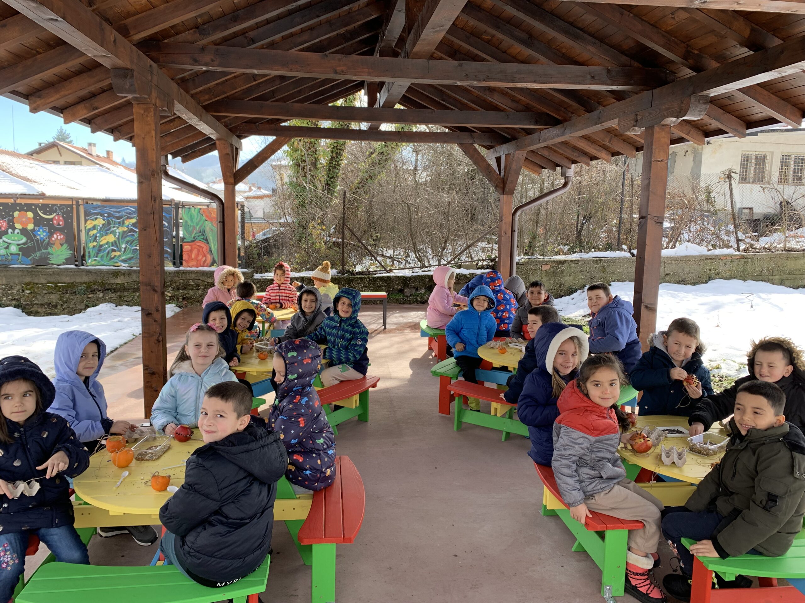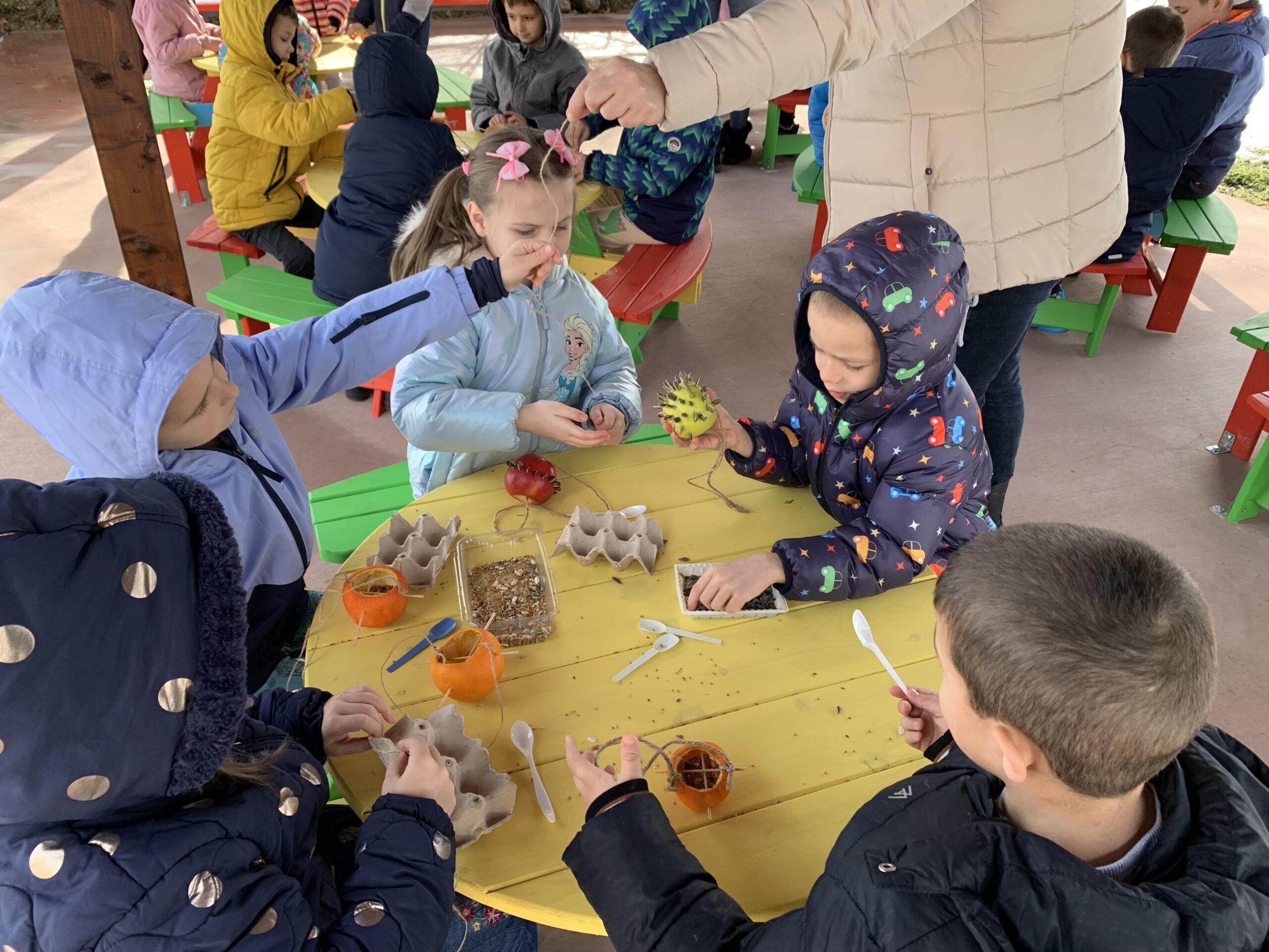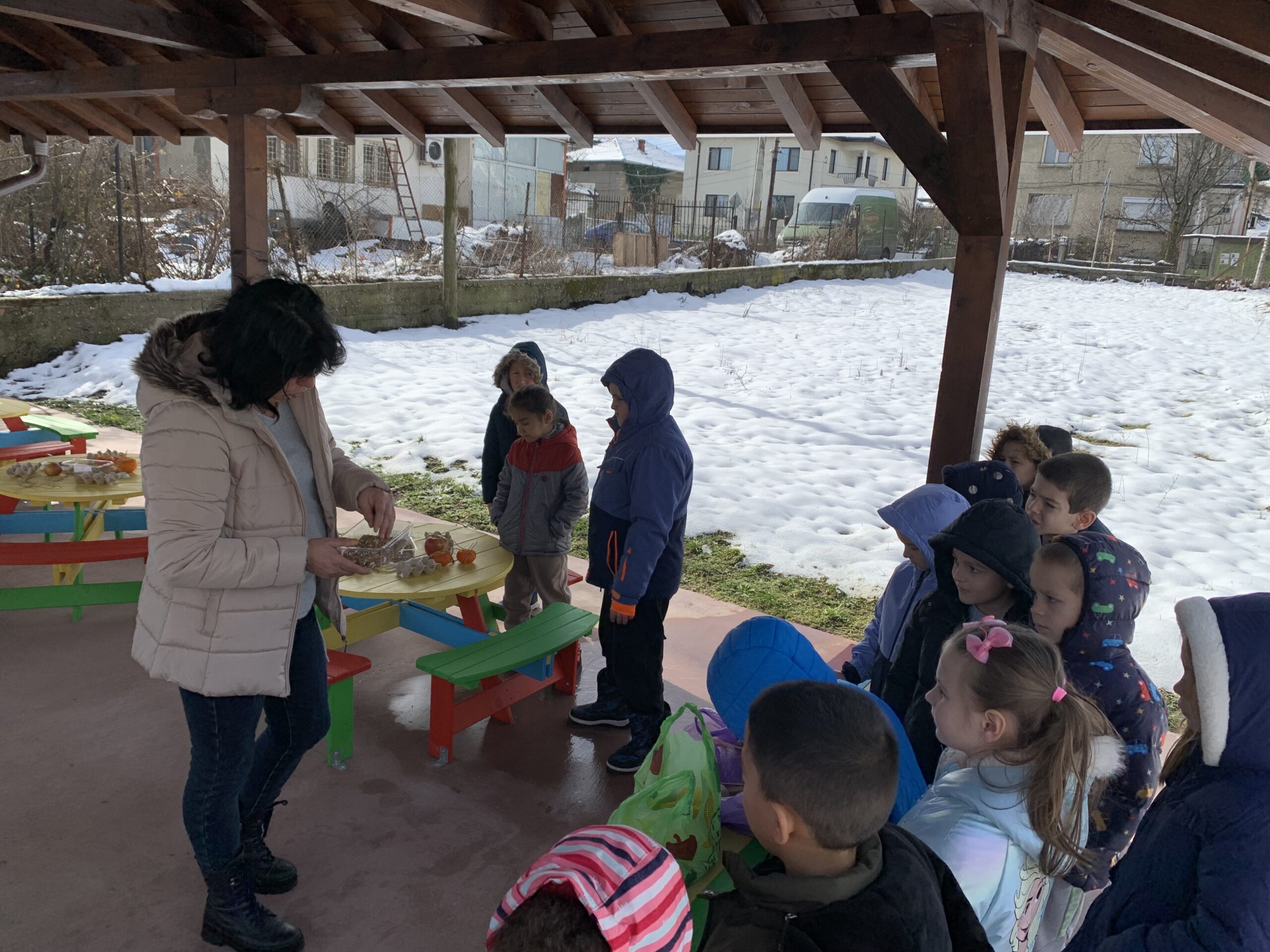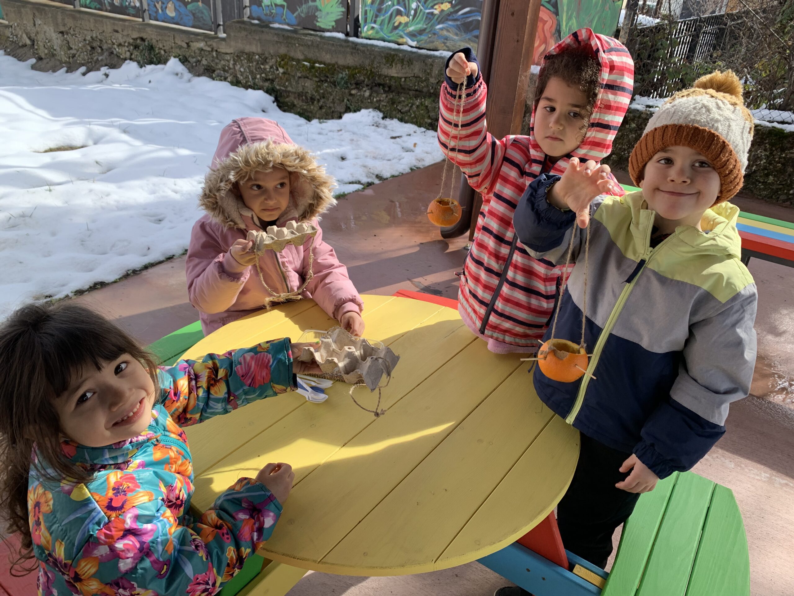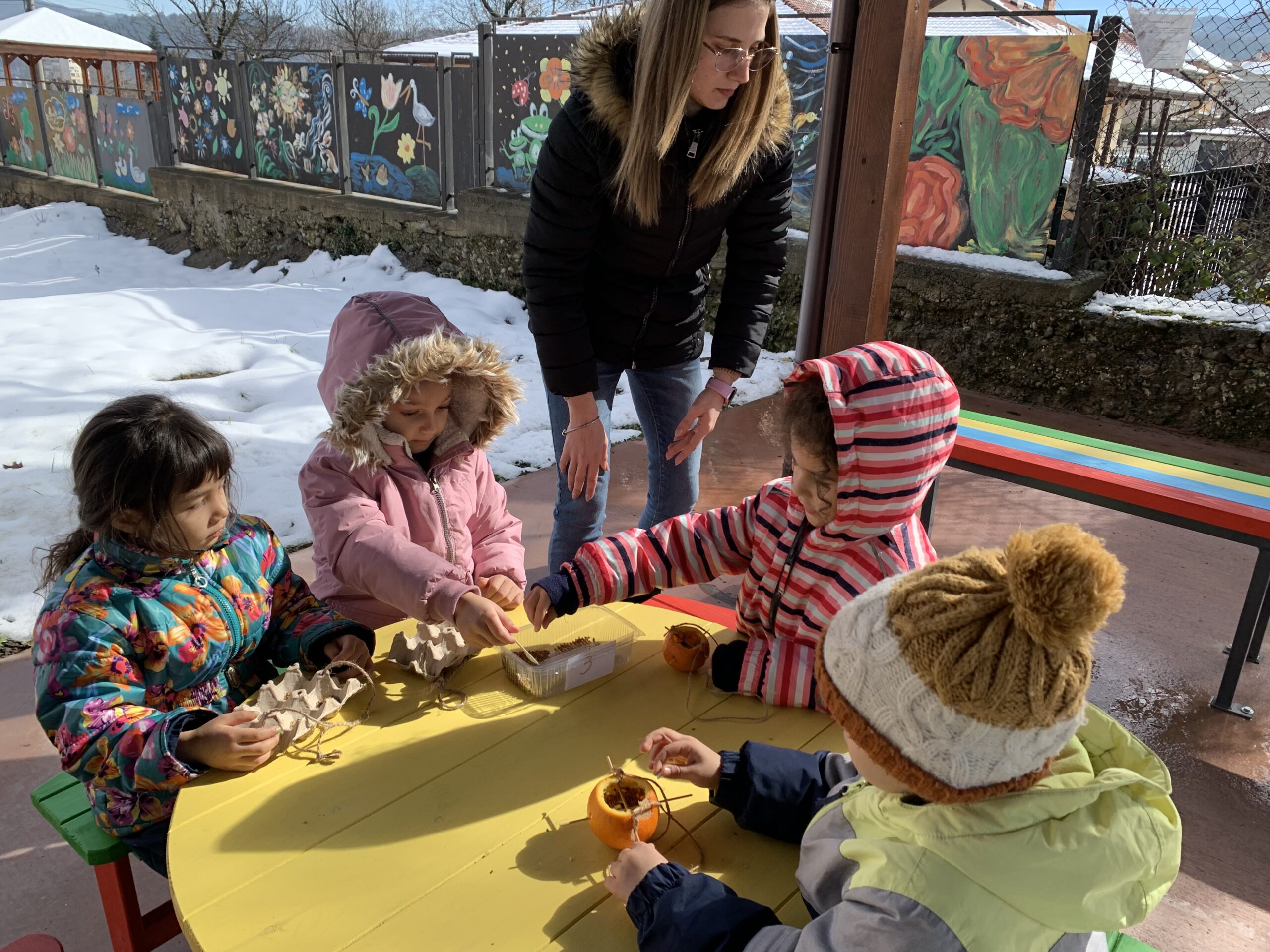 Зимата не е само студ и сняг. Тя дава чудесни възможности за активни игри и забавления на открито. Децата от група „Синигерчета“ и група „Пчеличка“ излязоха в двора на детската градина, за да се порадват на зимното слънце и да проучат какво се случва с техните приятели зимуващите птички. Снегът затруднява намирането на храна и част от видовете не успяват да оцелеят без човешка помощ. Затова малките палавници изработиха хранилки за зимуващите птици от екоматериали – картон, портокалови кори, ябълки, семена и др. Част от тях децата поставиха в двора на детската градина, а останалите – поставиха в близост до дома си.