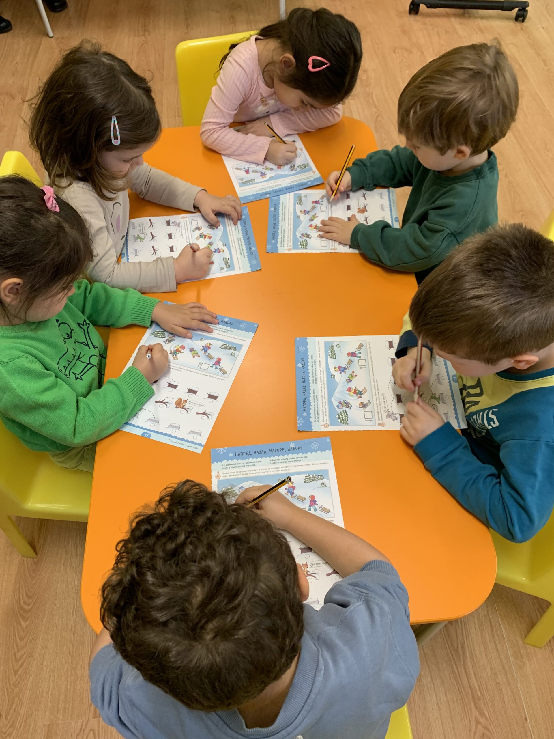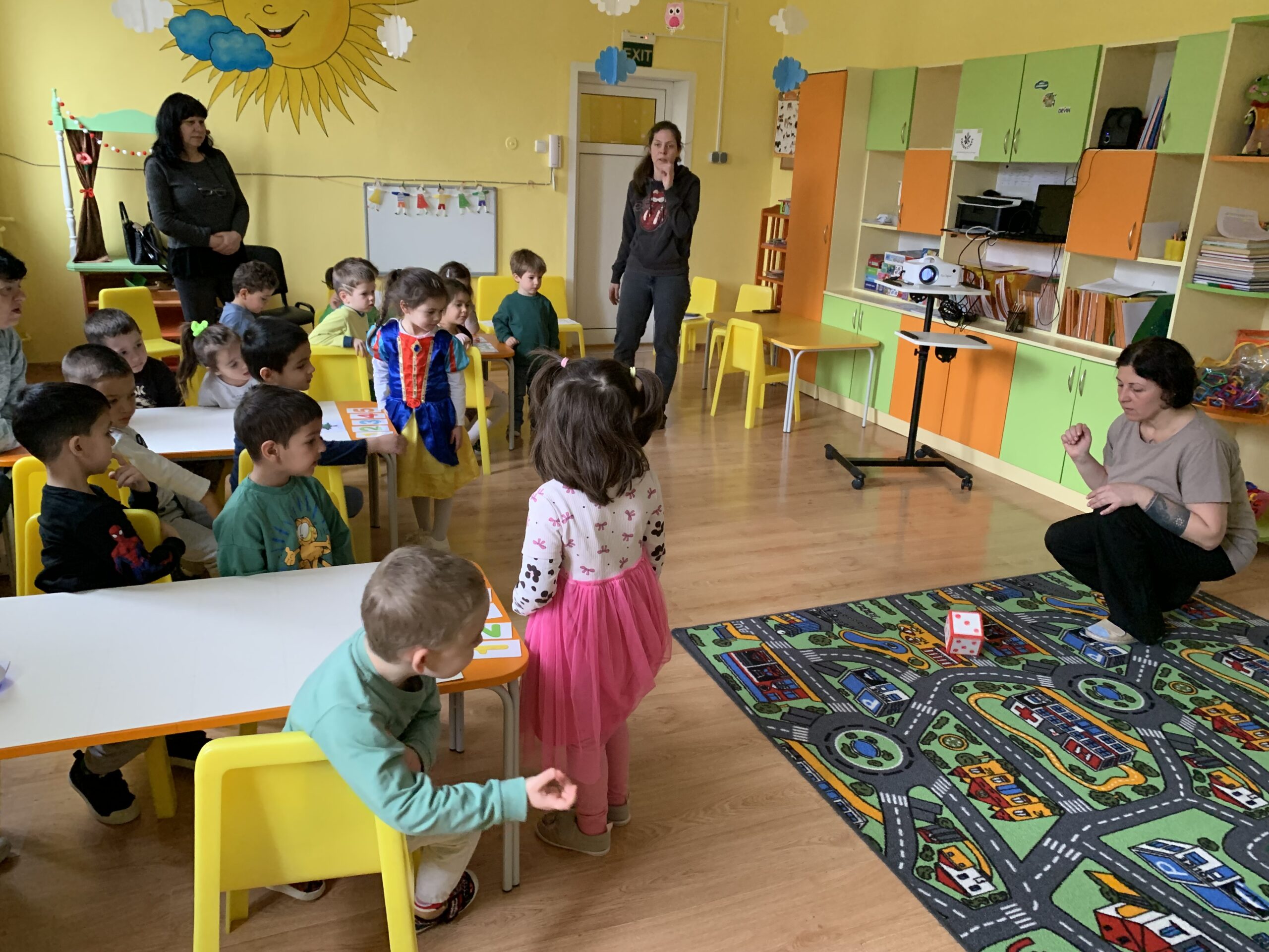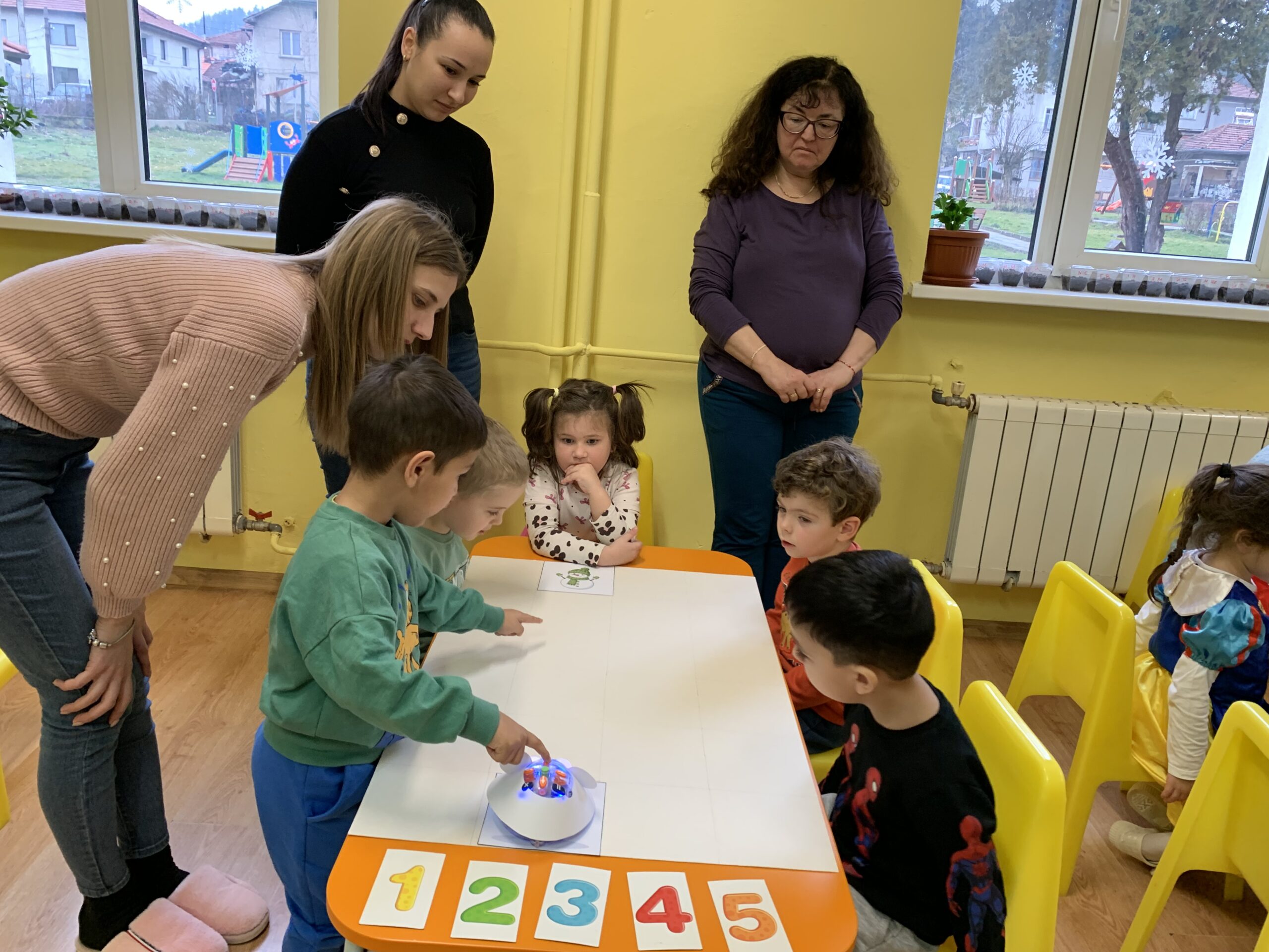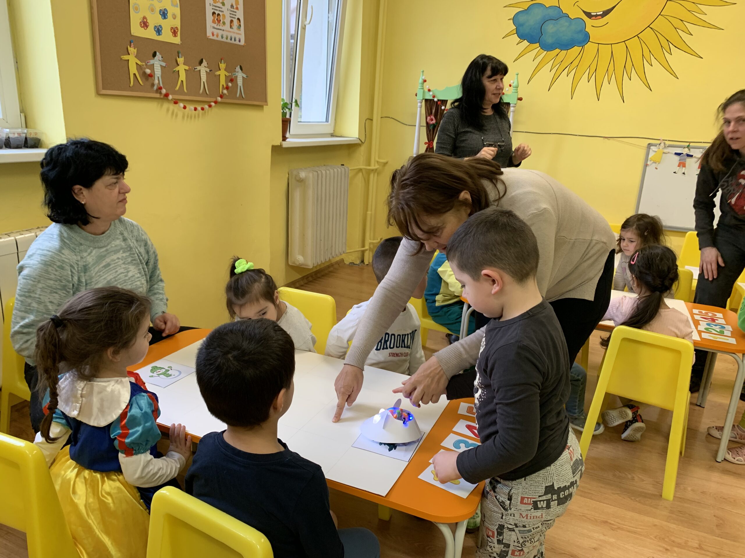 Слънчовците показаха знания и умения при използване на пространствените понятия напред – назад, нагоре – надолу. С желание се включиха в практически и игрови дейности за броене до пет и ориентиране в квадратна мрежа.